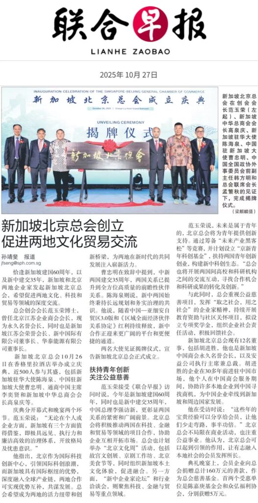 2025年10月26日,新加坡北京总会(以下简称“总会”)宣布正式成立。该总会由新加坡与北京两地的商界领袖、文化界人士共同发起,旨在进一步促进两国在经贸、文化、科技等领域的深度交流与合作。